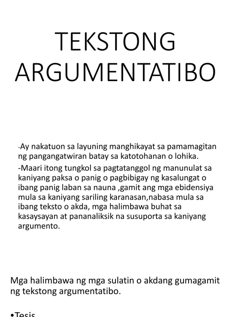 Ito ang panimulang punto na nais mong ipakita sa pamamagitan ng mga argumento. Mga dapat tandaan sa pagbuo ng Tekstong Argumentatibo. Tekstong Argumentatibo NARARAPAT NA IPAGBAWAL ANG PANINIGARILYO SA PUBLIKO.