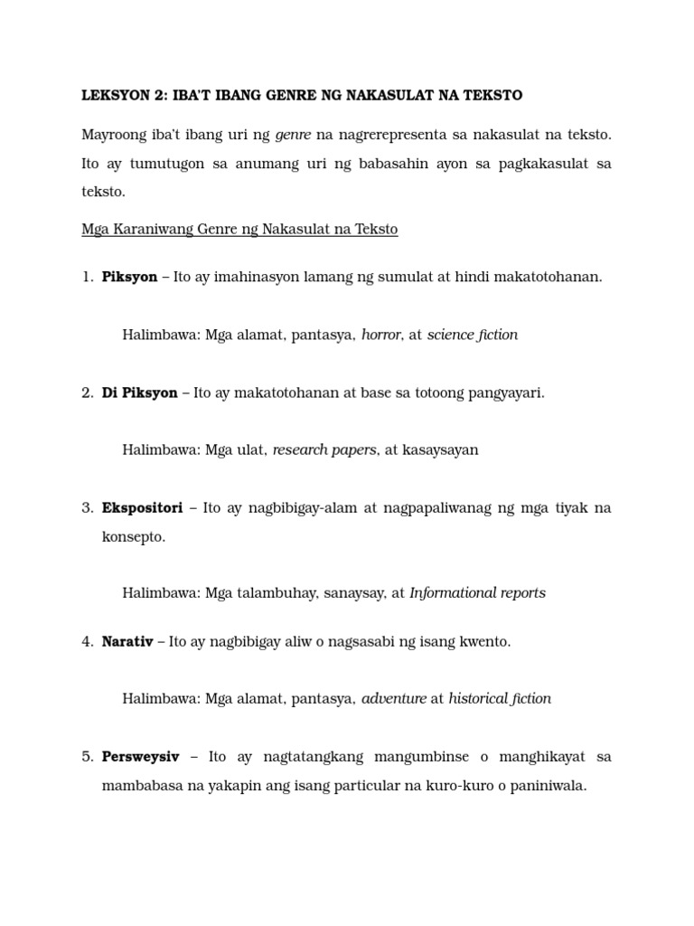 Hernandez Ang tula ay hindi pulos na pangarap at salamisim di pawang halimuyak. Piksyon ng agham kuwento di piksyon. Di-Piksyon-Mga aklat na naglalaman ng mga kwentosanaysaytulana halaw sa tunay na buhay o pangyayari.