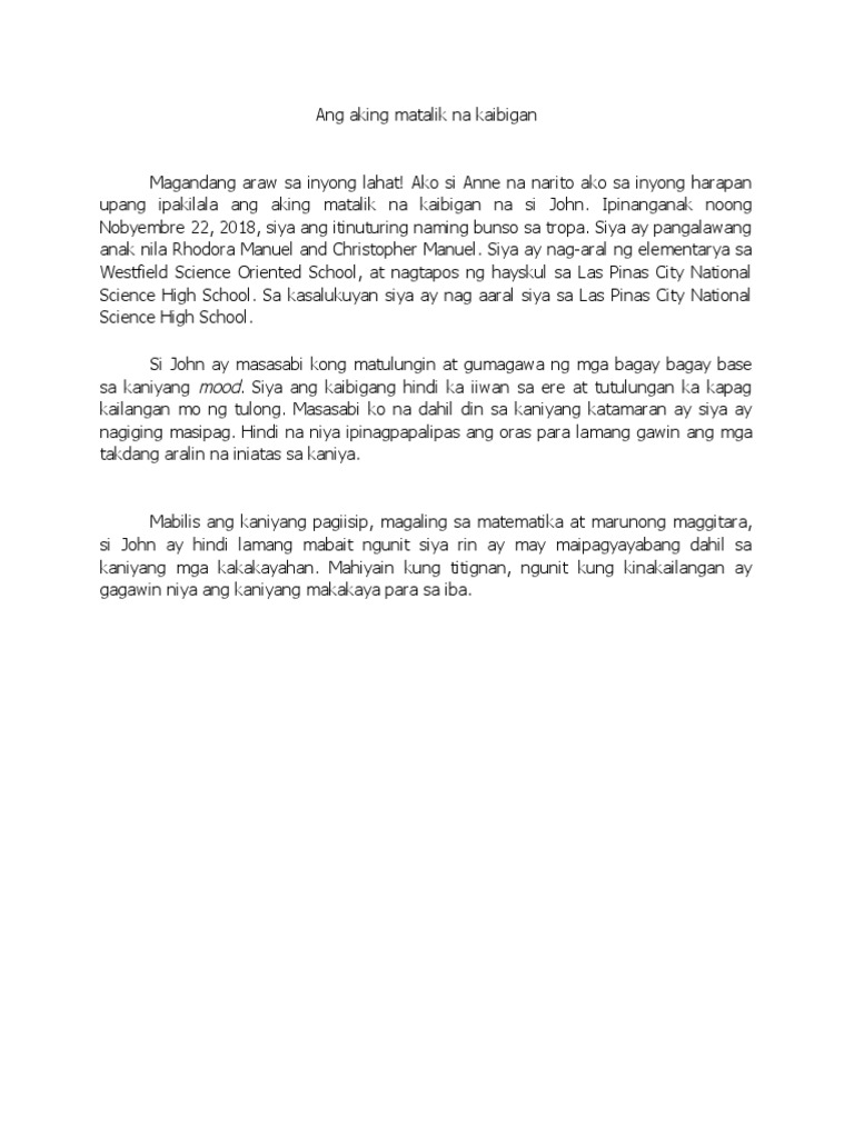 Tutulungan nila kayong maging mas mabuting tao at gagawing mas madali para sa. Ito ay dahil lahat tayo ay may indibidwal na mga katangian. Hanap mo ba ay mga halimbawa ng talumpati tungkol sa kaibigan.