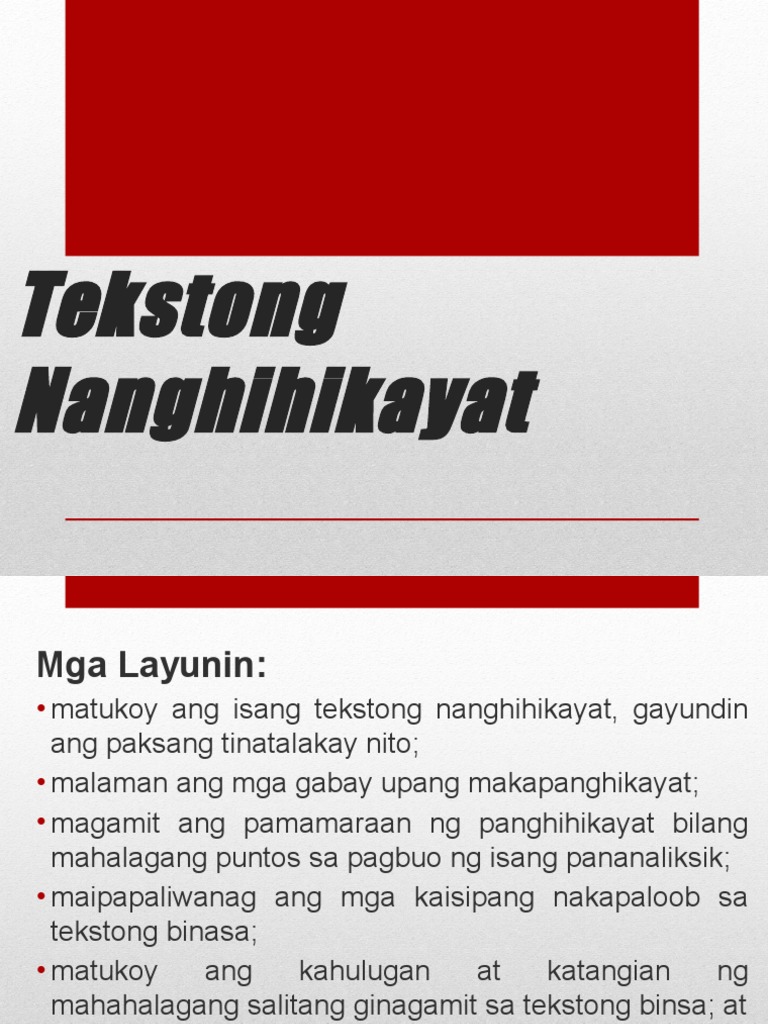 Tekstong Nanghihikayat Persuasive Layunin ng tekstong ito na himukin ang mambabasa na kumilos at gumawa ng isang bagay na naayon sa kagustuhan ng manunulat. Maipapaliwanag ang mga kaisipang nakapaloob sa. Isang karangalan para sa akin ang pagpaunlakan ninyo ako bilang Direktor ng ATC International Association in Tea and Coffee Industry upang mailunsad at ipakita sa publiko ang isa sa pinakabago naming produkto.