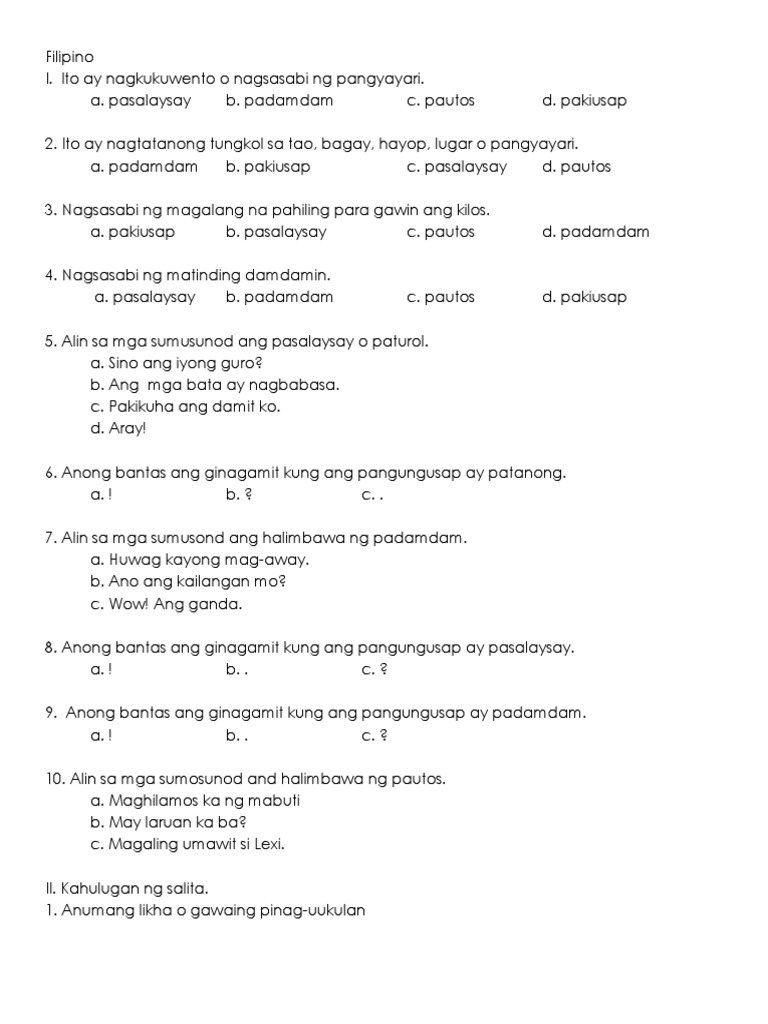 A Si Manuel Roxas ang ikalawang pangulo ng Republika ng Pilipinas. Kapag wala ang bantas magdudulot ito ng pagkalito sa mga mambabasa. A Ano ang pangalan mo.