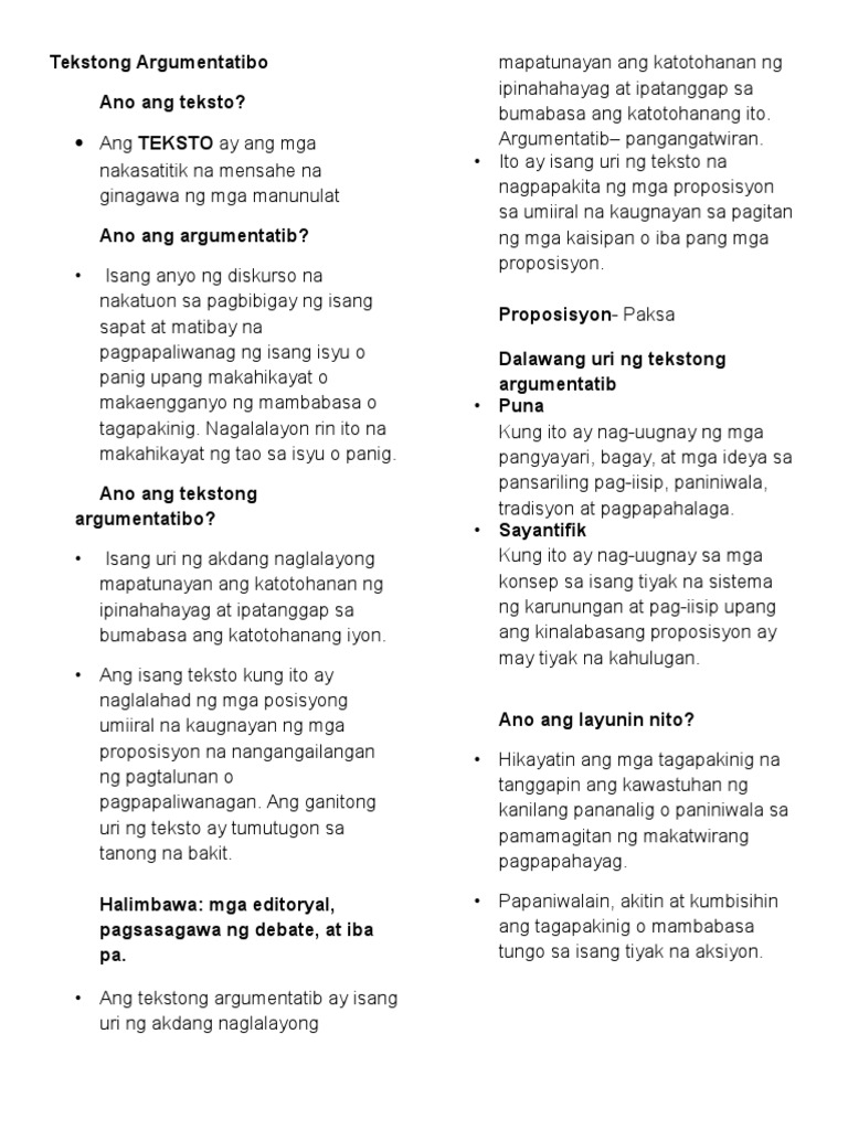 Every paper is written from scratch by. Isa sa mga halimbawa ng mga sulatin o akdang gumagamit tekstong argumentatibo ang tesis posisyong papel editoryal papel na pananaliksik petisyon Elemento ng Isang Tekstong Argumentatibo Naiiba ang tekstong argumentatibo sa tekstong nanghihikayat dahil batay ito sa lohikal na pangangatwiran at suportado ng mga impormasyong hango sa pananaliksik upang mapatunayan ang.