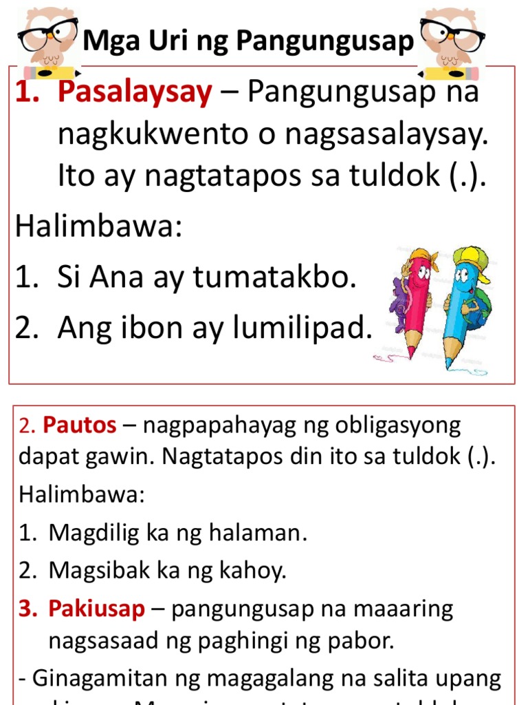 Pang-uri- sa pangngalan o panghalip naglalarawan Mga halimbawa. Some of the worksheets for this concept are Filipino Pangungusap na pasalaysay at patanong Contributedbycherylgatchalian isulatsapatlangkungang Pagsasanay sa filipino Pagsasanay sa filipino. Binubuo ito ng simuno at panguri at gumagamit rin to ng ibat ibang bantas gaya ng tuldok kuwit tandang pananong at marami pang iba.